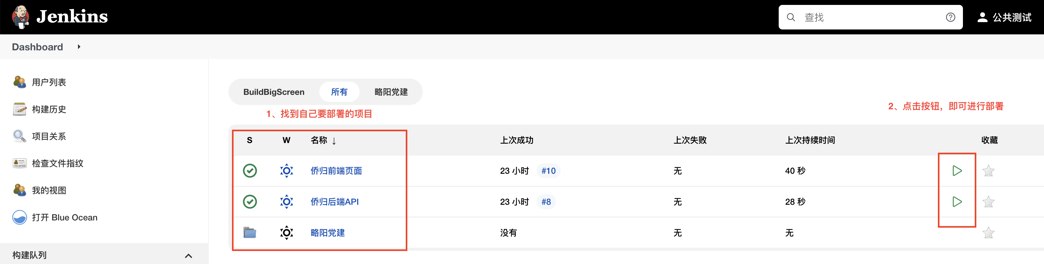 - 登录后,进入Jenkins页面,找到自己要测试的项目,点击按钮进行部署